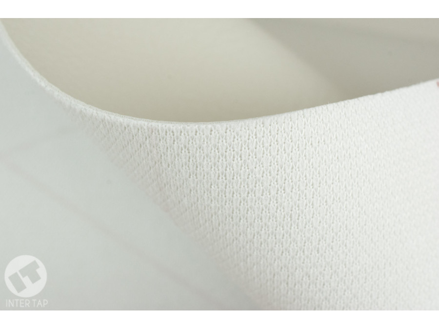 Materiał jest nawinięty na kartonową tubę, a cała rolka jest zapakowana w grubą, przezroczystą folię.