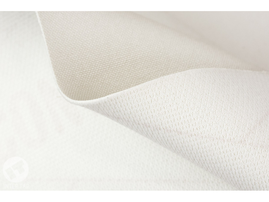 Materiał jest nawinięty na kartonową tubę, a cała rolka jest zapakowana w grubą, przezroczystą folię.